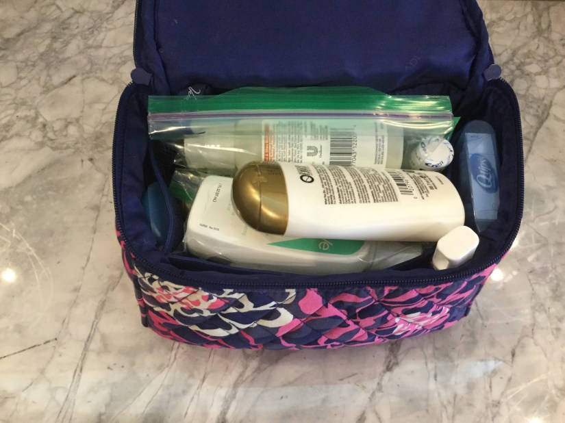 Which is why I streamlined my packing program! I figured, why am I packing all this stuff over and over again, when I bring the same stuff every time? Time to make my go-bag (also, is super helpful for soon-to-be-moms. No need to worry about forgetting something in your rush to the hospital, just grab your toiletry bag, and you’re good to go!)